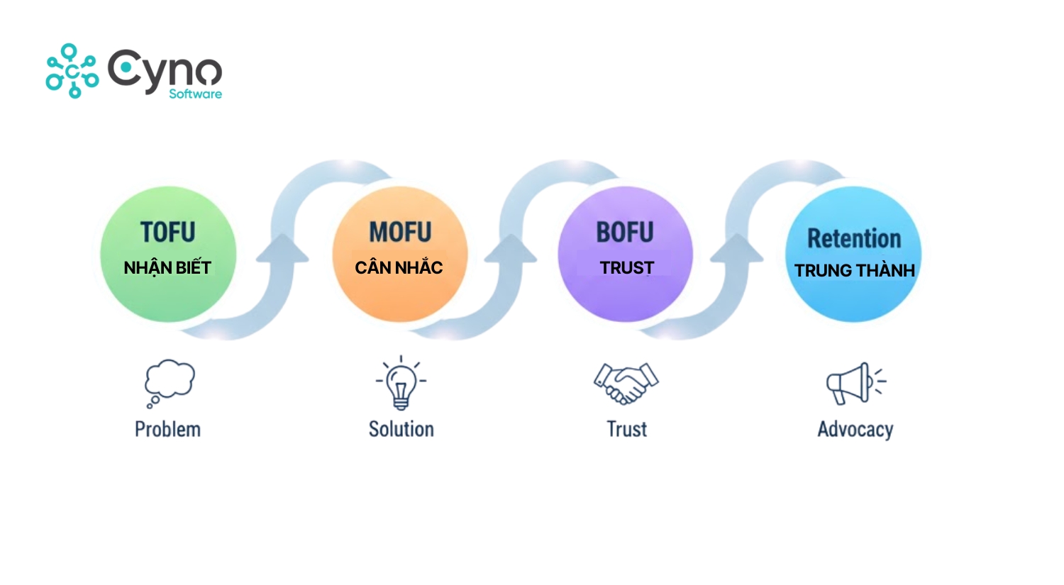 TOFU (Nhận biết) → MOFU (Cân nhắc) → BOFU (Quyết định) → Retention (Trung thành)